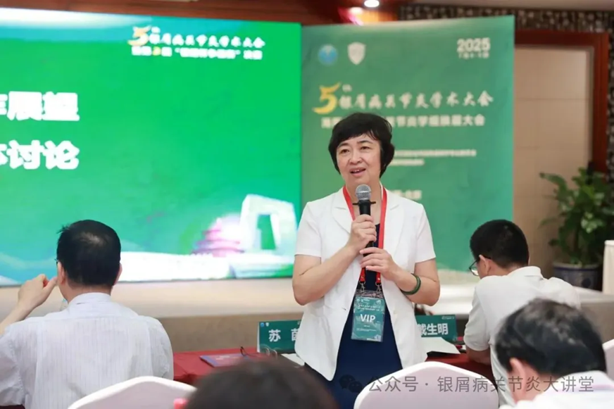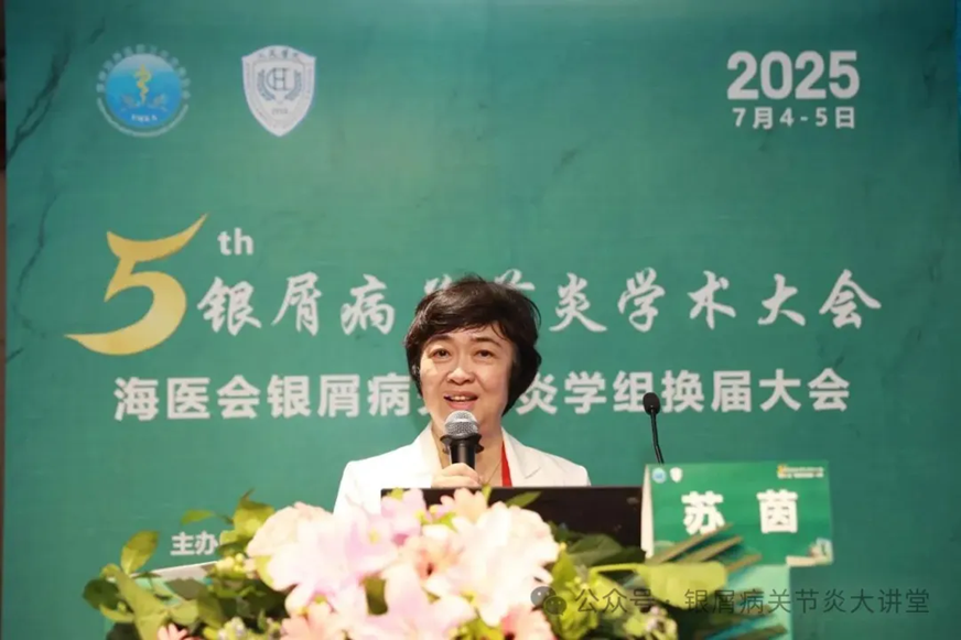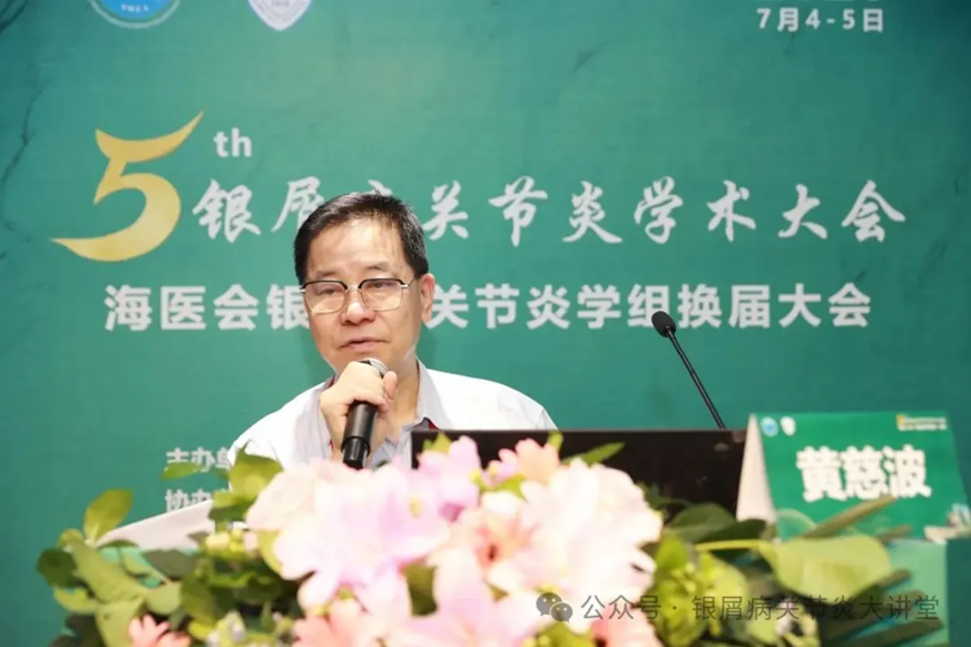 海峡两岸医药卫生交流协会风湿免疫病学专委会主任委员黄慈波教授在致辞中,高度肯定了学组在我国银屑病关节炎知识普及与学术推进中的积极作用。他特别提到,学组自成立以来,在苏茵组长的带领下,在各位副组长、组员及青委的支持下,精心组织了多场线上线下会议、专业培训以及病例大赛等特色活动,成效斐然。同时,学组人才队伍不断壮大,新鲜血液持续注入。黄教授满怀期待地表示,希望学组在苏茵组长的引领下,能够迈向国际舞台,展现中国风采。