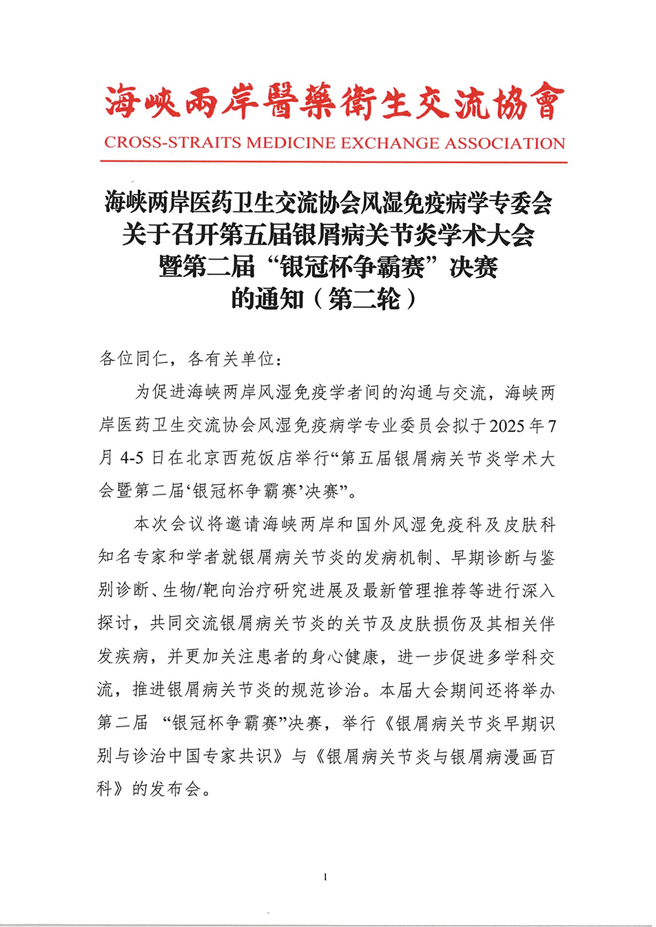 会议通知-第五届银屑病关节炎学术大会暨第二届‘银冠杯争霸赛’决赛”