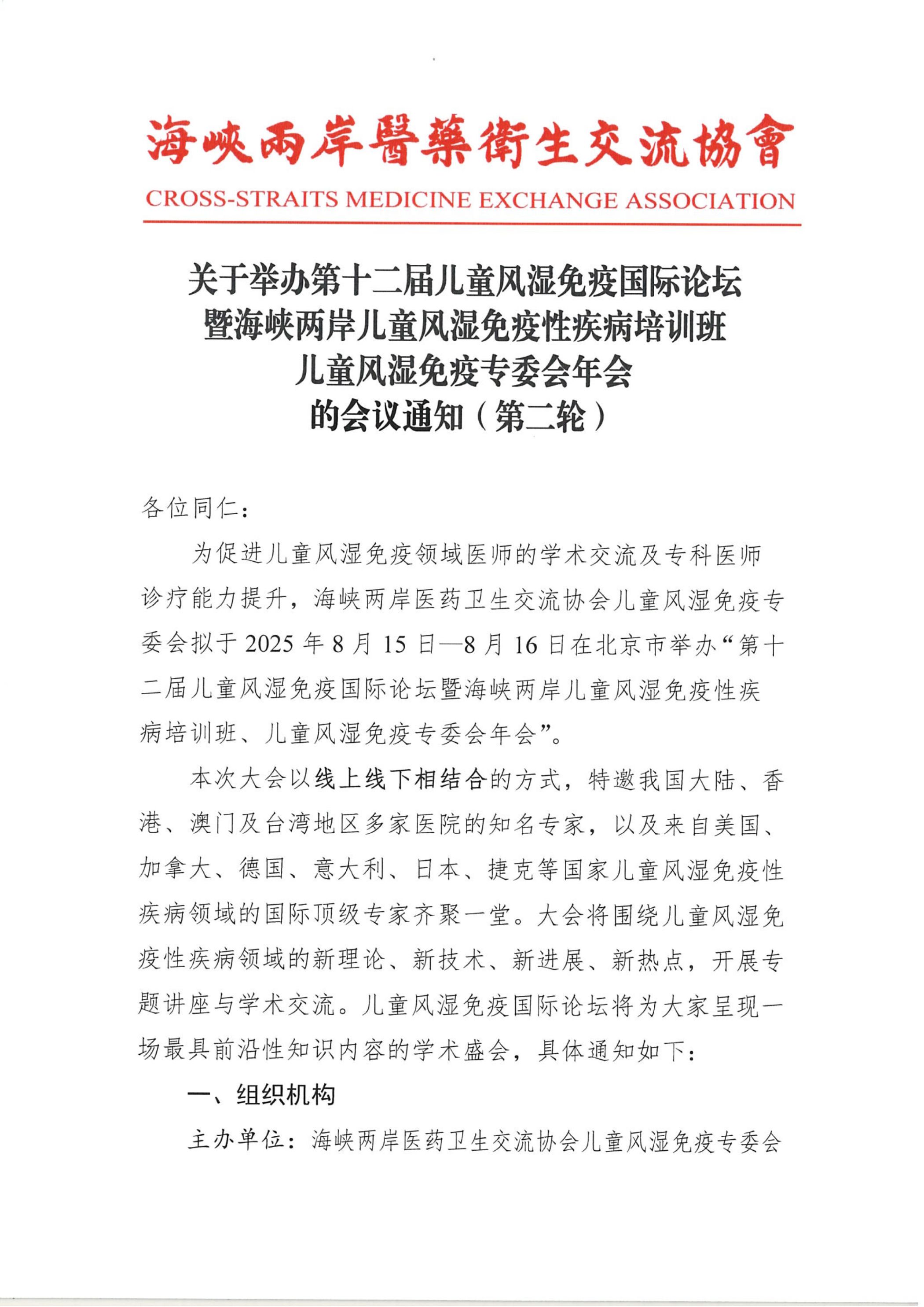 会议通知-第十二届儿童风湿免疫国际论坛暨海峡两岸儿童风湿免疫性疾病培训班儿童风湿免疫专委会年会